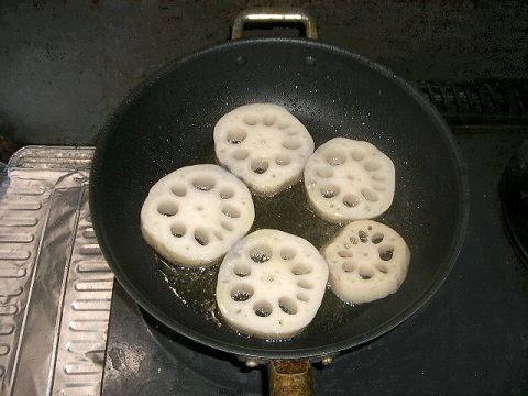②オリーブオイルをフライパンに約70~100ml入れレンコンを中火で焼く。